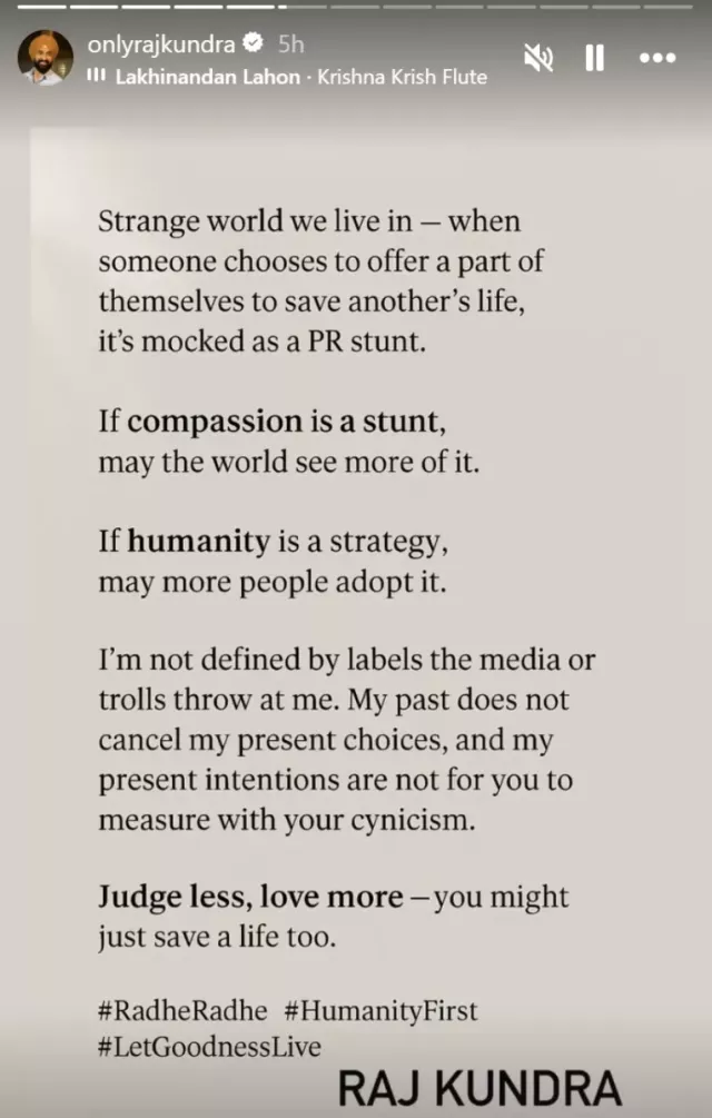 Videos of Raj Kundra and his wife Shilpa Shetty’s recent visit to Premanand Maharaj garnered a lot of media attention. The fact that Raj Kundra offered Premanand Maharaj his own kidney attracted notice. Social media users began mocking him when his remark went viral, calling his gesture a publicity hoax. Raj Kundra responded to the criticism in his Instagram account on August 15, 2025. He wrote: