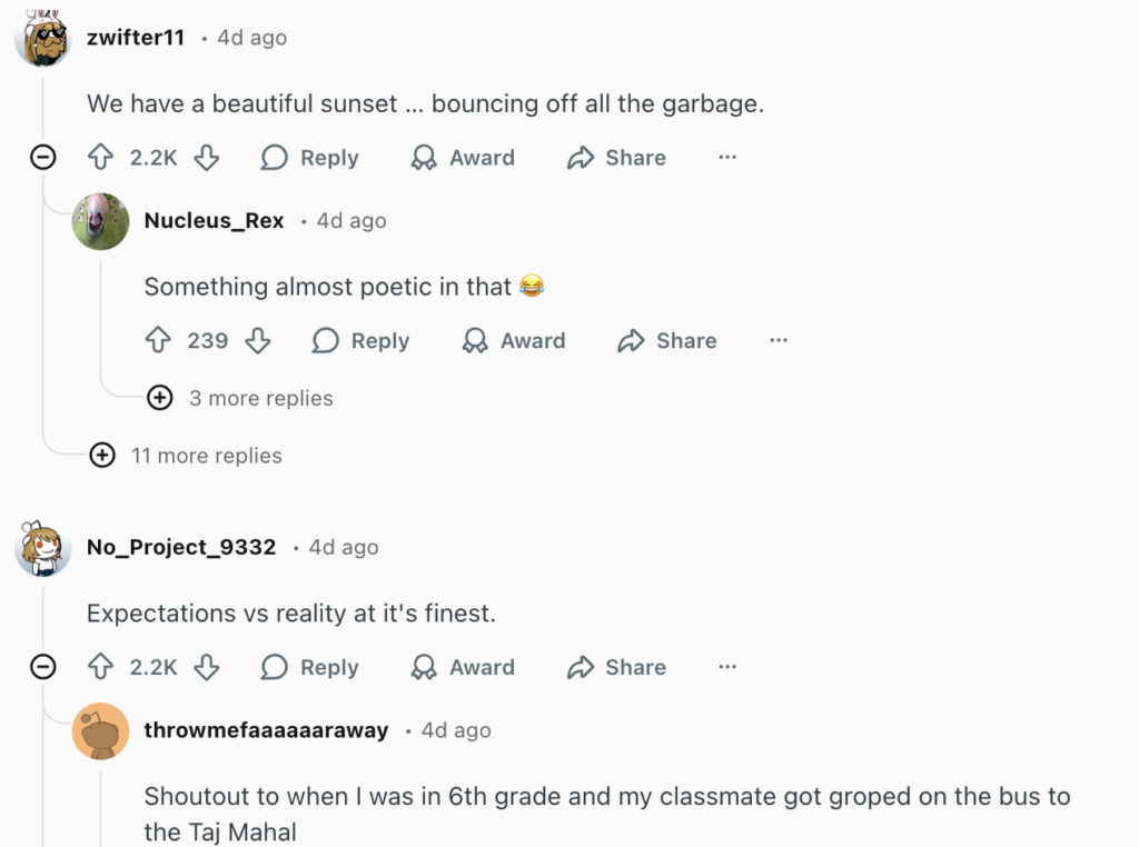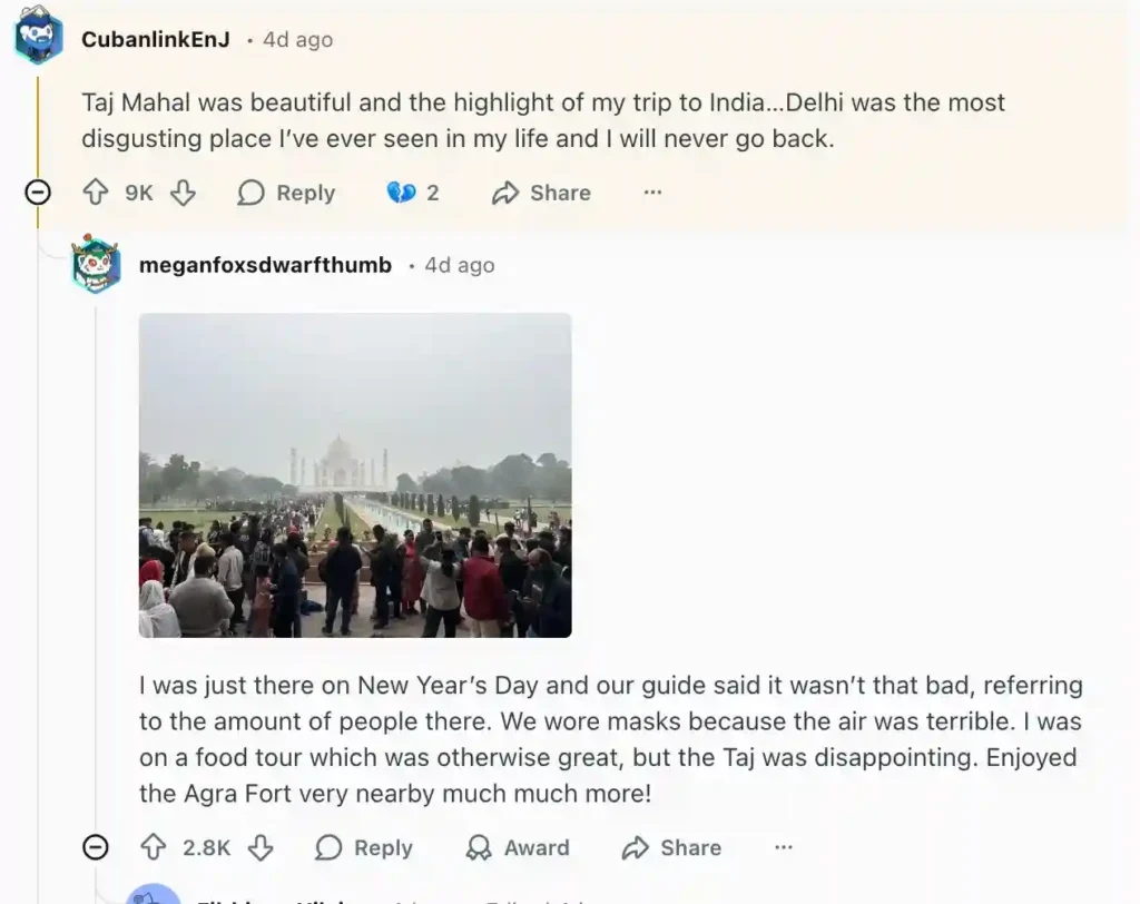 - Embarrassed Indians: Many expressed shame, with comments like: “This is why foreigners judge us – we can’t even keep our most famous site clean.” Others admitted: “Taj Mahal is beautiful, but the path is a gauntlet of harassment and filth.”