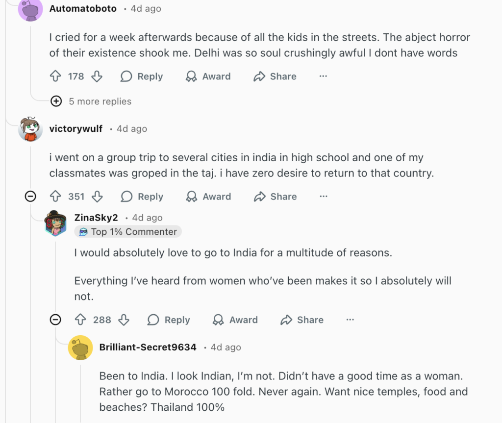 - Defenders: Some hit back, accusing the tourists of selective filming: “They show only the bad parts to shame India – why not the beauty inside?” Comparisons were drawn to other