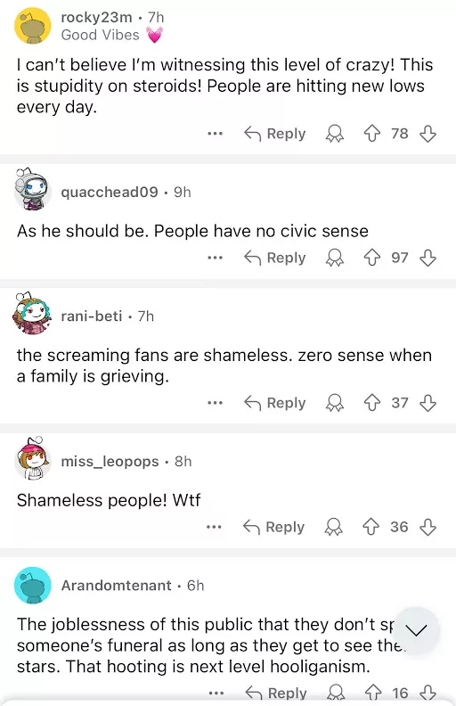 Online users took notice of the situation and criticised the fans’ actions. Considering the delicate nature of the situation, many people thought the acts were disrespectful. “This level of insensitivity is unbelievable!” remarked one person. People are going beyond anything. “It is beyond shameful that people would show such disrespect at a funeral just to see their favourite celebrity,” another person said.