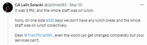 The tweet, which was published on May 30, included a picture of an SBI branch with what looked to be a staff photo taken over lunch. The commentary that accompanied the image criticised SBI’s services by contrasting the picture with the claim that SBI’s services never change, even though the world can change significantly.