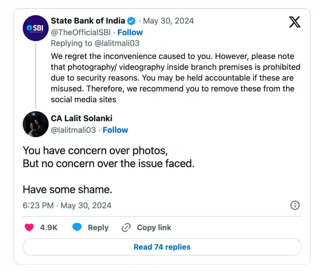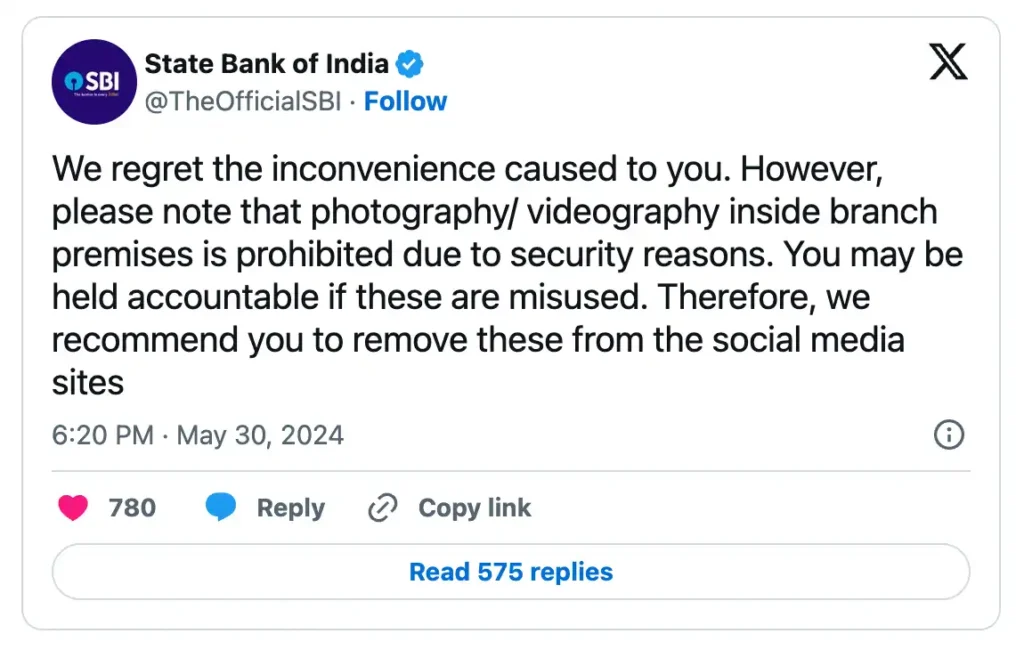 SBI responded by asking the user to remove the post, citing security risks related to taking pictures or videos on branch property. SBI apologised for any trouble caused and warned the user not to share these photographs, pointing out that they may be misused.