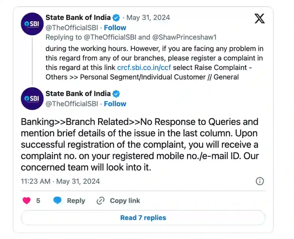 After the post was shared on [platform name], SBI noticed it and responded, asking the user to take it down.