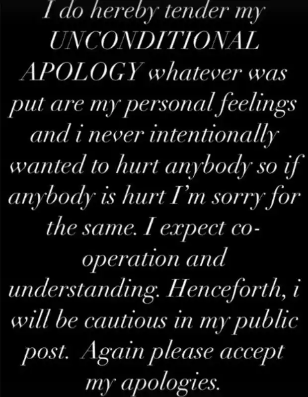 I do hereby tender my UNCONDITIONAL APOLOGY. Whatever was put are my personal feelings and I never intentionally wanted to hurt anybody. So anybody is hurt, I’m sorry… Henceforth, I will be cautious in my public posts.