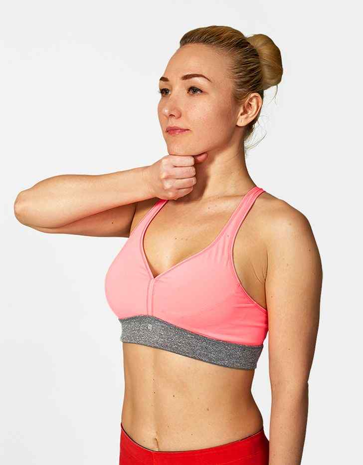 Make a fist with your hand and lift it to your chin. For 5 seconds, press your chin into your fist, then relax for 5 seconds. Rep 2-3 times more.