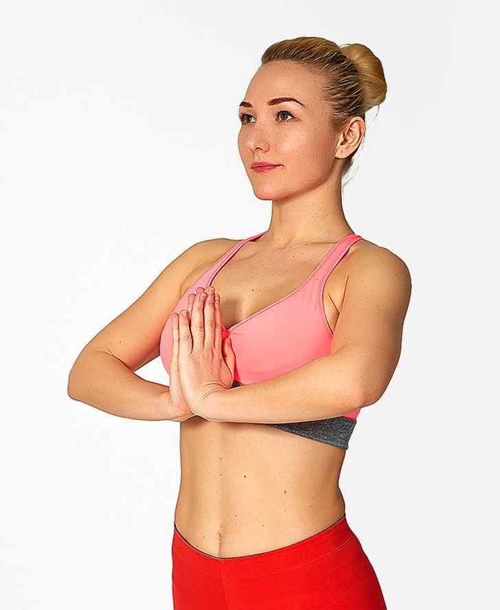 Put your hands in front of your chest and clasp them together. Press them together firmly enough to put your pectoral muscles to the test. Make sure you maintain a straight back.