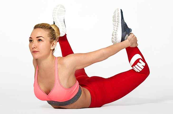 Lie down on your stomach with your legs bent at the knees and your ankles grasped. Hold this position for 20 seconds, then take a 10-second break if you’re a newbie. Rep this process three times more.