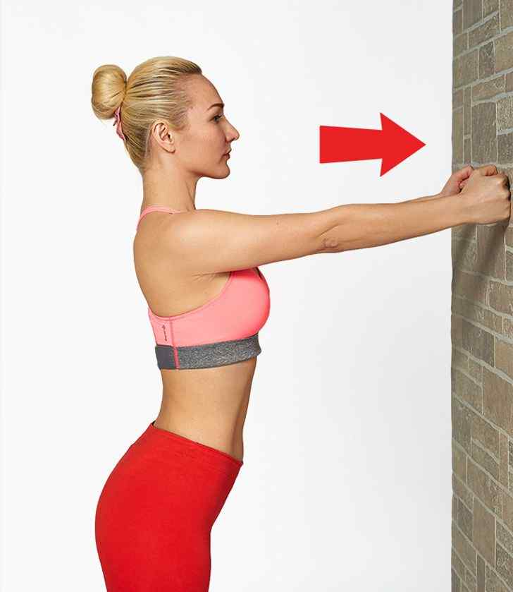 Start by standing half a metre away from a wall, stretching your arms out in front of you and pressing your fists against it. You’ll notice that your pectoral muscles are being worked. Press for 20 seconds, then take a ten-second break. Rep 3 times more.