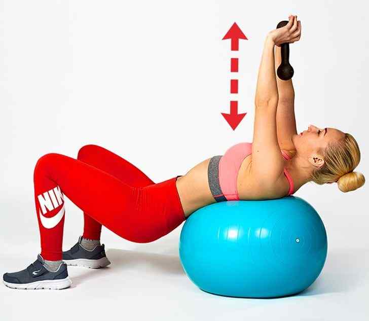 Lay down on a bench, a fitball, or the ground. Strain your chest with dumbbells and start lifting them up at the same time. Then, shortly after lowering them, raise them again. Rep this exercise eight times more. The dumbbells should be heavy enough that the last rep is challenging. Make three sets.