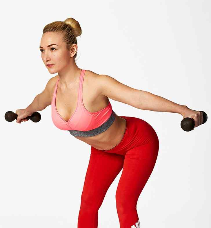 This exercise will stretch your muscles while also helping to contour your bust. Take your dumbbells with you. When you stand up, bend your knees slightly and lean your torso forward. Raise your arms to the sides as you inhale (they should also be slightly bent at the elbows). Your forearms should be parallel to the ground during this exercise. Execute two sets of 12 repetitions each.