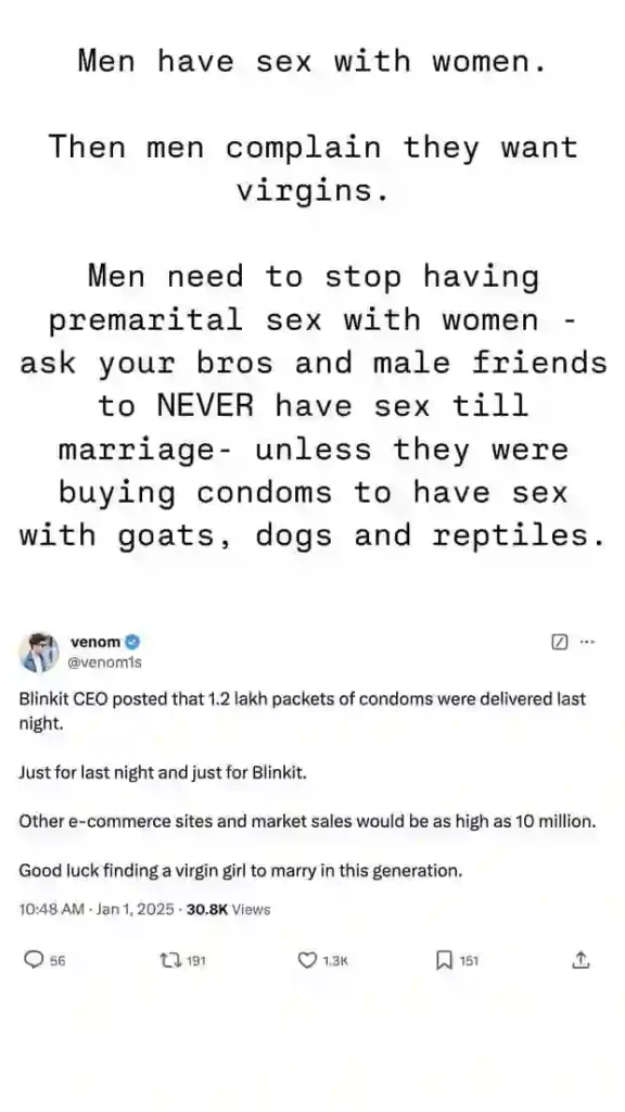A tweet sent on X (previously Twitter) by a user named Venom on January 1 sparked a lot of outrage due to its obvious misogyny. The uproar started when the CEO of Blinkit presented an intriguing statistic: on New Year’s Eve, 1.2 lakh condom packets were delivered throughout India.
