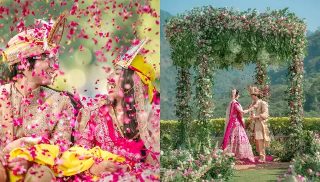 Headpieces? Radha-Krishna inspired – golden filigree crowns that crown their commitment with a touch of mythology, turning the aisle into an ancient epic. No over-the-top ostentation, just thoughtful touches: Handwoven textiles from local artisans, eco-friendly florals that fade into the foothills, and a playlist that pulses from Bollywood beats to Uttarakhand folk – a soundtrack as synced as their steps.