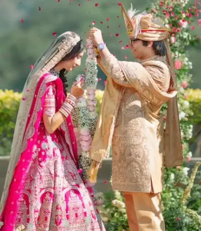 What makes this wedding a wardrobe wonder? The details that dance between cultures and customs. Sourav’s sherwani? A beige beauty with subtle embroidery that nods to his North Indian roots, paired with a crisp white kurta for that groom-glow. Avantika? The absolute showstopper in her pink lehenga – intricate zari work whispering romance, the skirt flaring like a flower’s first bloom. But the veil? The veil steals the scene: Beige silk embroidered with “I found my forever Mohit” in elegant script, a personal poem draped over her dupatta like a love letter from the universe.