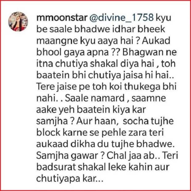 And one more thing, I thought it’s better to show you your standard before I block you. Understood you illiterate guy? Now go from here with your ugly face and spread filth somewhere else.”