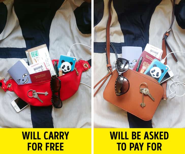 The hand luggage has to be packed in the luggage compartment above you during the flight, or put in front of you under the bench. Therefore, it is safer not to keep papers, tickets, money, a telephone or a charger in it. Often also a crossbody bag or clutch (even the small ones) comes under this criterion. However, if you have other things in your carry-on bag, some airlines may ask you to pay for extra space.