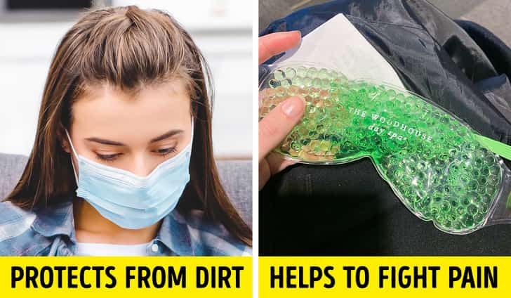 A gel mask can be helpful too— if you keep it under a stream of cold water to cool it off, you can use it to relieve a slight headache. It is safer to use a moisturizing cloth mask after the ride.
