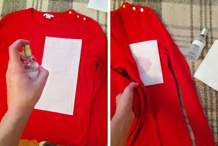 It’s pretty simple: take an ordinary tissue, spray it with perfume and place it close to your clothing item’s collar, then fold it in the usual way. The longer the tissue stays with the fabric, the more the perfume scent will be transmitted.