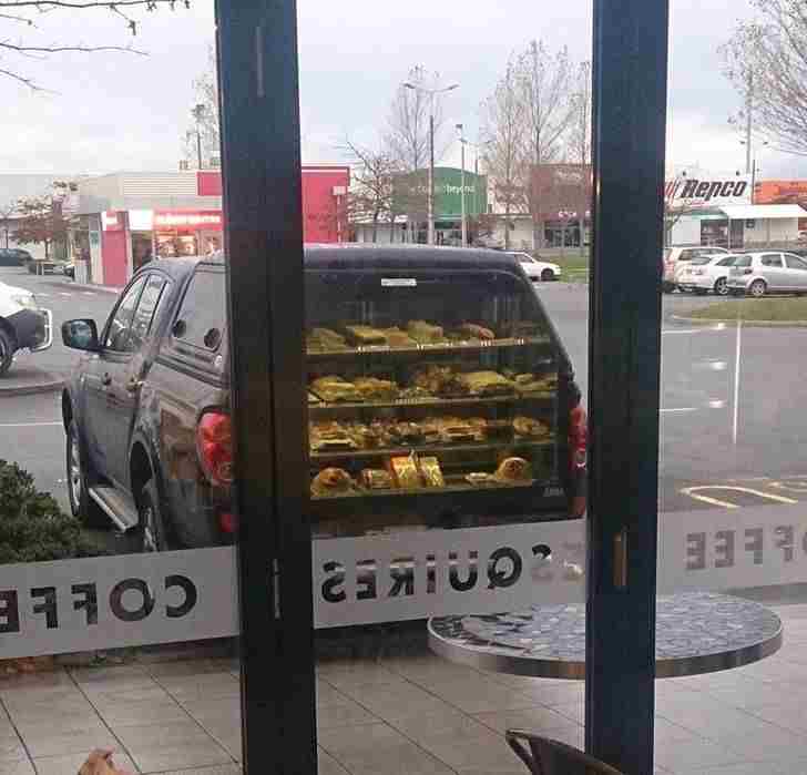 18. “This coffee shop window reflects that the car is selling pieces out of its trunk!”