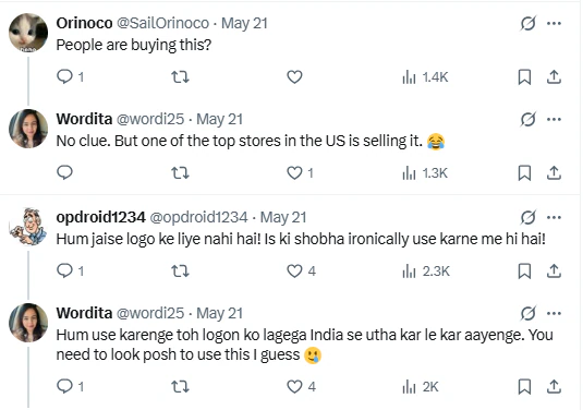What the devil is this scam? Nordstrom, a high-end department store, is selling Jhola for $48! Even though I get homesick, I haven’t had this amount of nostalgia. tweet.com/Zouw2rLpke — May 21, 2025, Wordita (@wordi25)