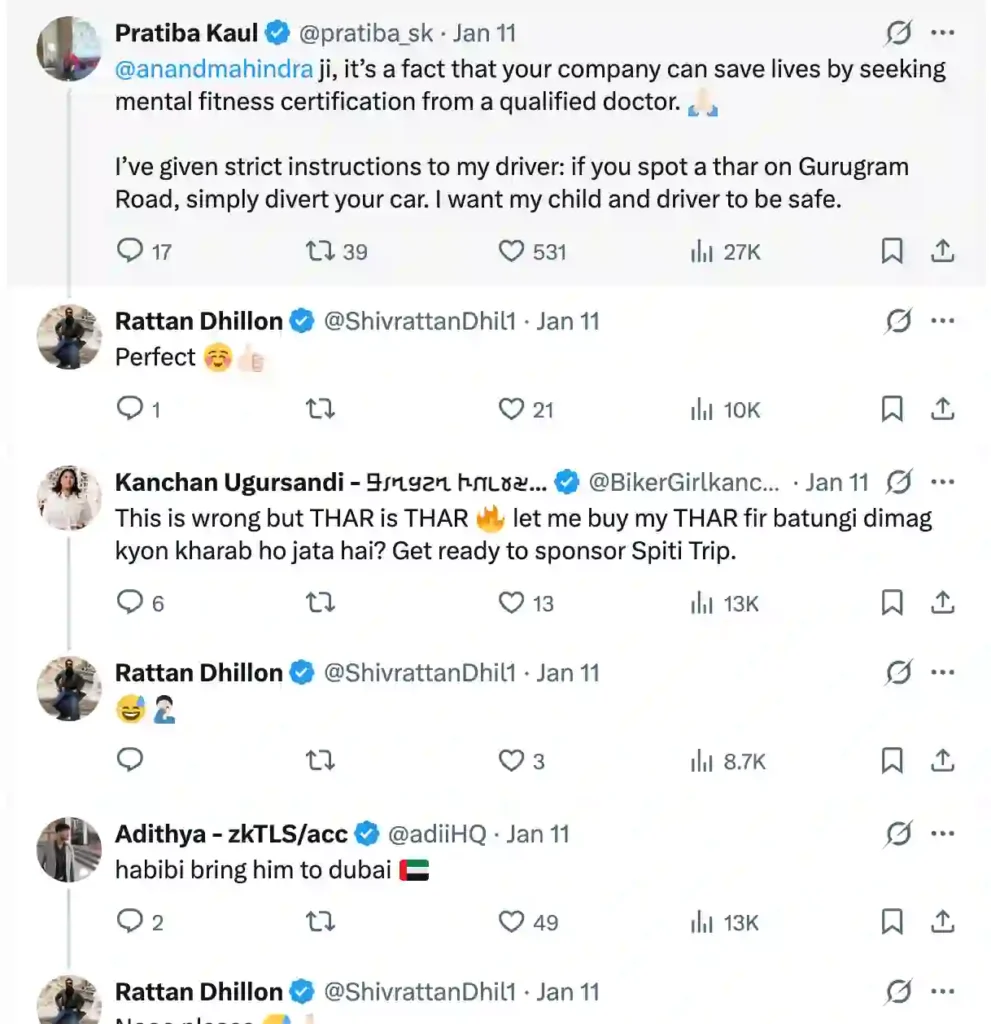 • Humorous takes: “Let me buy my Thar first, then I’ll tell you how one’s mind goes insane.” Or warnings: “Fathers will stop marrying their girls to boys who own Mahindra Thars.”