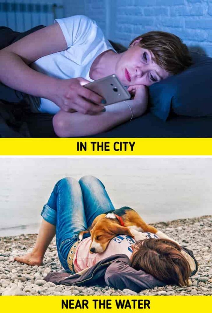 Due to 2 things: the waves and the air, we sleep more soundly around the water. In contrast to loud, sharp sounds like sirens or screams, our brain interprets the lapping of waves as an unthreatening sound, calming us into a very relaxed state. It can also boost serotonin and dopamine production, our feel-good hormones.