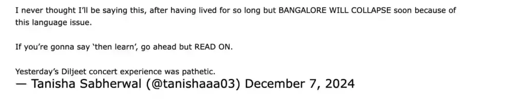 Her primary tweet stated that she believes Bangalore would soon collapse. She continues by saying that studying Kannada is not the answer and advising readers to continue reading to find out what transpired at the Diljit Dosanjh event.