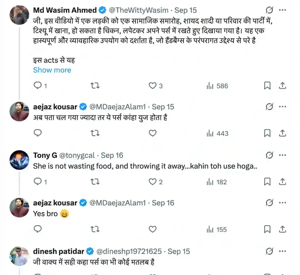 We’ve all been there—staring at that last tempting bite at a wedding or event, not wanting to waste it. But this woman’s quick thinking elevates it to legend status. The video captures her discreetly grabbing the chicken leg, wrapping it in a tissue, and slipping it into her handbag without missing a beat. Posted by user @MDaejazAlam1 on X, it’s become a symbol of Indian jugaad culture, where innovation meets everyday life. While some speculate she was saving it for later, others see it as a smart anti-waste move in a country where food conservation is key.