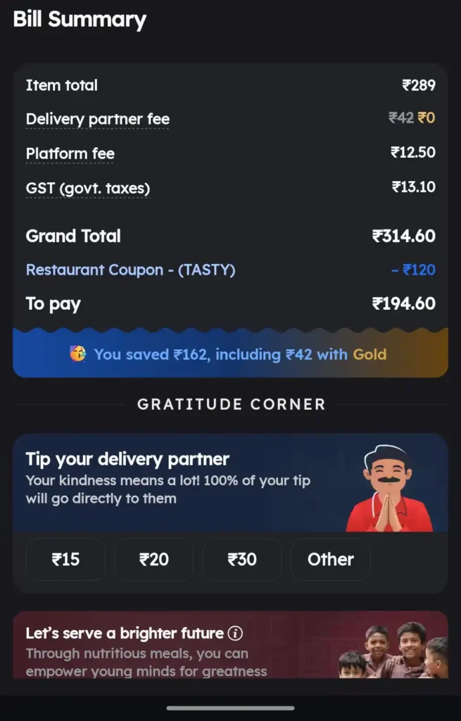 Tanmay (@jinxx_boy), your average Ahmedabad foodie fighting the Friday blues, wasn’t hunting for headlines – he was just hungry for honesty. Scrolling Swiggy for his Dal Makhni fix, he noticed the neighbourhood spot’s price parity play: Rs 289 based on both apps. But the checkout? A chasm: Swiggy’s subtotal dipped to Rs 144.50 after a hefty restaurant discount, tacking on a Rs 14.99 platform fee, free delivery (thanks to Swiggy One), and Rs 7.23 taxes for a total of Rs 167. Zomato? Same starting point, but a stingier Rs 120 coupon left the subtotal at Rs 169, taxes calculated on the post-discount subtotal pushing the final to Rs 194.60 – a Rs 28 premium for… pixels?